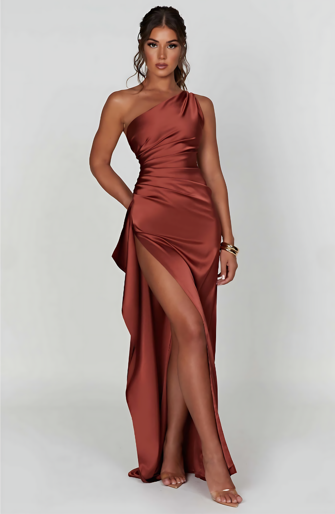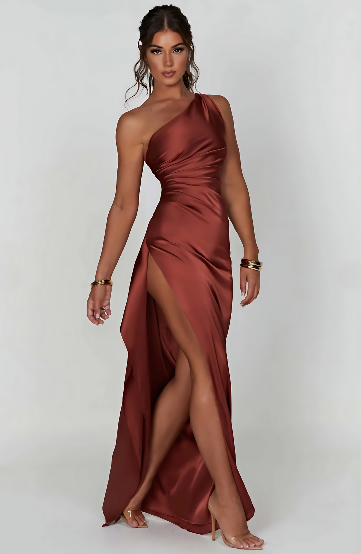 Damska sukienka maxi na jedno ramię z rozcięciem