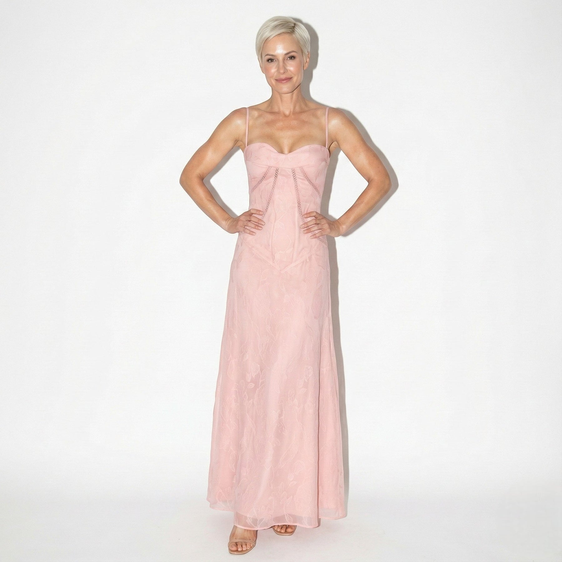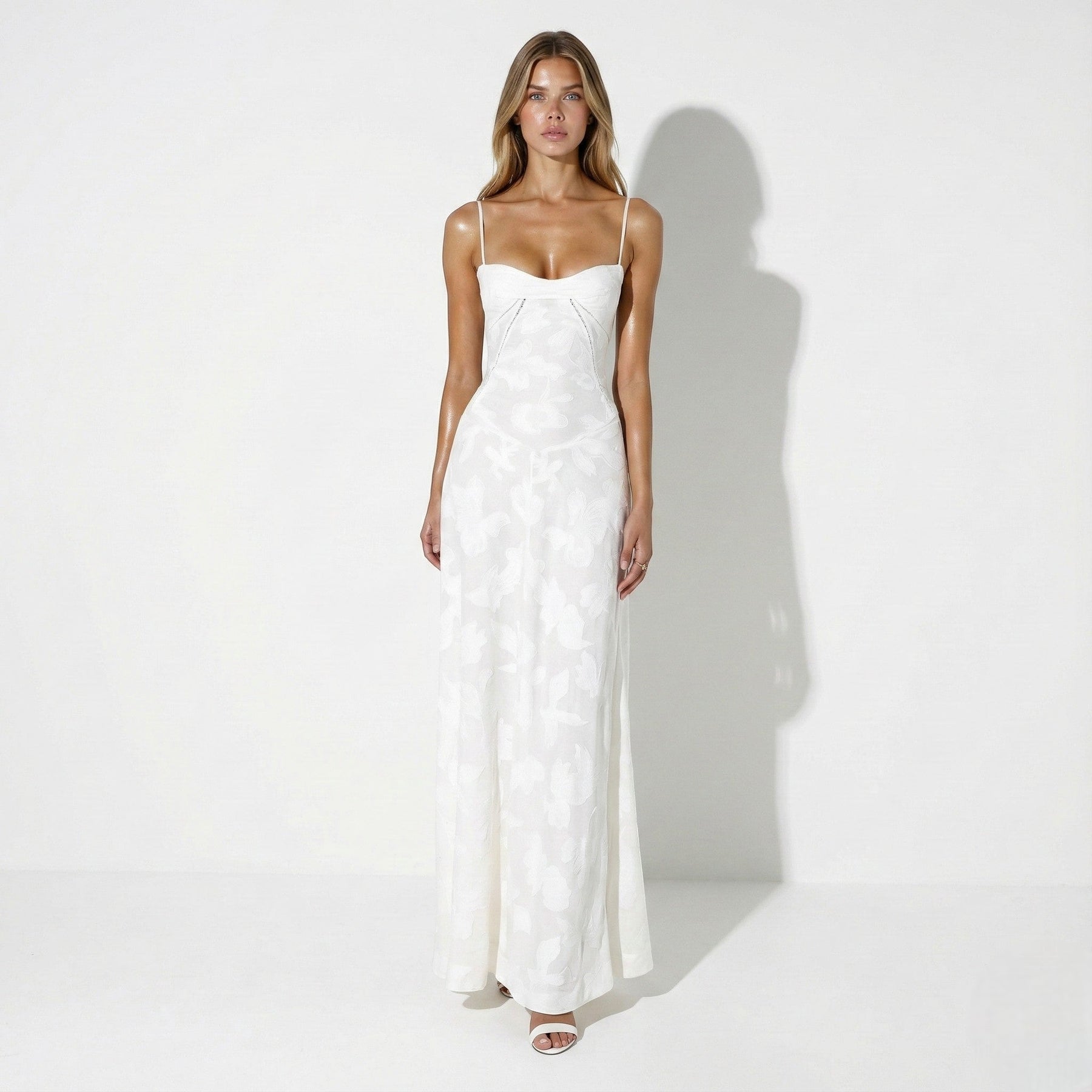 Sukienka posiada dekolt w kształcie serca z cienkimi ramiączkami, a następnie dopasowaną górną część z widocznymi liniami szwów. Talia przechodzi w spódnicę o długości do ziemi, zachowującą jednolitą pionową linię. Na całej powierzchni zastosowano koronkę żakardową z motywem kwiatowym, która nadaje sukience wyraźną, teksturowaną strukturę.